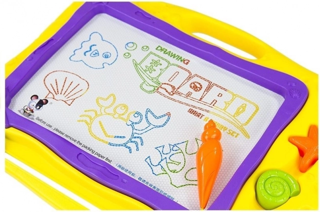 Objavte zábavnú a praktickú hračku pre malých umelcov – magnetickú kresliacu tabuľku v morských farbách s farebným pozadím rozdeleným do 8 sekcií. Vďaka magickému mazaniu posúvačom môžu deti kresliť znova a znova bez neporiadku. Súčasťou sú 3 figúrkové pečiatky (srdiečko, hviezdička, koliesko) a ergonomický stylus v tvare mušle pre pohodlné držanie a rozvoj kreativity aj jemnej motoriky.