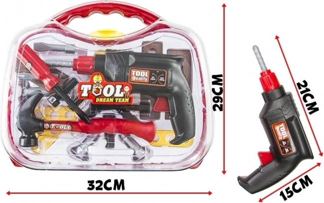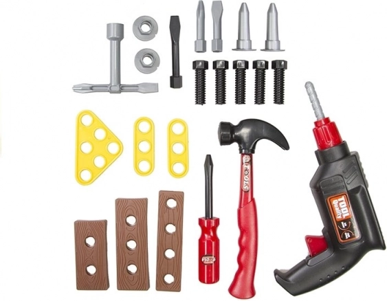 Súčasťou je realistická hračka vŕtačky, funkčný skrutkovač s vymeniteľnými nadstavcami, kladivko, skrutky a tri doštičky na precvičovanie montáže. Všetko je vyrobené z ľahkého, odolného plastu bezpečného pre detskú hru.