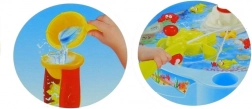 Tečúca voda roztáča žltý mlynček a vytvára malý vodopád. Deti objavujú princípy príčina–následok a trénujú jemnú motoriku pri nalievaní vody.