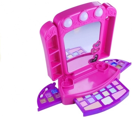 Kúzelná ružovo‑fialová toaletka pre malé parádnice prináša hodiny tvorivej zábavy. Má funkčné zrkadielko s tromi svetielkami, praktické priehradky na doplnky, vysúvaciu zásuvku s farebnými očnými tieňmi a lícenkami a bočné sety leskov na pery. Bezpečná konštrukcia, hladké tvary a kompaktné rozmery sú ideálne pre deti od 3 rokov.