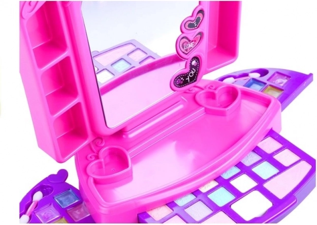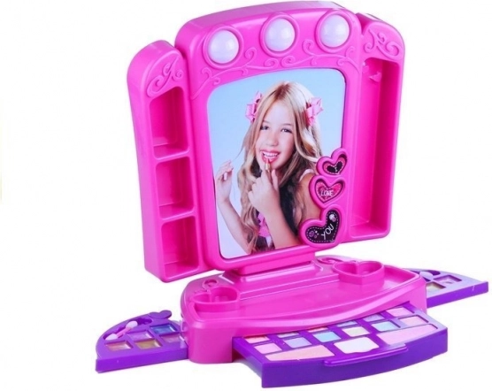 V prednej časti nájdete zásuvku plnú farebných tieňov a líceniek, nechýba aplikačná hubka a obojstranné pinzety. V bočných trojuholníkových kazetách sú trblietavé lesky na pery v pestrej palete odtieňov od ružovej po žltú a modrú. Dva háčiky na boku zrkadla sú ideálne na zavesenie korálikov či retiazok, aby sa nezamotali.