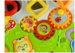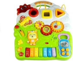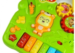 Farebné klávesy 1–7, ozubené kolieska a svietiace tvary rozvíjajú jemnú motoriku, rytmus a vnímanie farieb a tvarov. Slniečko bliká do rytmu hudby.