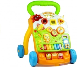 Interaktívne chodítko 2v1 pomáha deťom s istotou zvládať prvé krôčiky a zároveň prináša veľa zábavy vďaka odnímateľnému panelu. Ten obsahuje klavír so 7 farebnými klávesmi, svietiace geometrické tvary, ozubené kolieska a ďalšie tlačidlá s melódiami a zvukmi. Panel možno jednoducho odňať a používať samostatne pri hraní doma, v postieľke alebo na cestách. Uvítacia fráza je v angličtine.