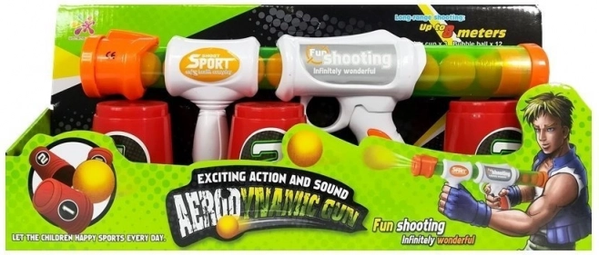 Súčasťou balenia je 12 mäkkých guľôčok a niekoľko číslovaných kelímkov na vylepšenie mierenia a strategickej hry. Dizajn v bielo-oranžovej farebnosti dodáva výrobku moderný vzhľad, zatiaľ čo polopriehľadný zásobník umožňuje ľahko sledovať množstvo dostupnej munície.