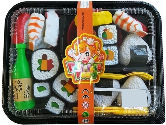 - 1× Sushi Box; 19× hračkové sushi (hosomaki/futomaki/nigiri/onigiri); 2× tanierik; 2× sada príborov (nožík + vidlička); 1× fľaštička