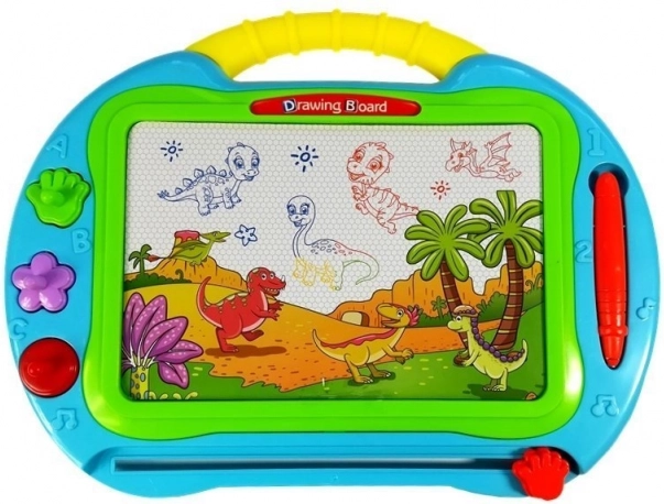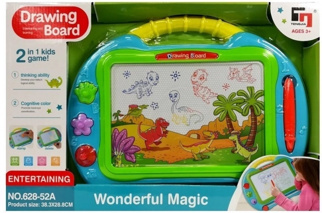Táto veľká magnetická kresliaca tabuľka umožňuje deťom kresliť a písať znova a znova – bez neporiadku a bez papiera. Pod povrchom obrazovky sú železné piliny, ktoré sa pri dotyku magnetického pera ukladajú do viditeľných stôp. Pečiatky v tvare kolieska, labky a kvietka dodajú obrázkom originálne detaily a pomôžu rozvíjať predstavivosť.