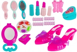 V balení nechýbajú nevyhnutnosti pre malé stylistky: pohodlné plastové sandáliky, sada na úpravu vlasov vrátane kefy, hrebeňa a natáčok, oválne zrkadielko, koráliky na výrobu šperkov a imitácie rúžov. Všetko je prehľadne uložené v kufríku s rukoväťou a zacvakávacím vekom, takže sa nič nestratí a upratovanie je hračka.