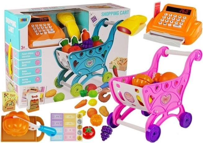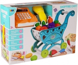 Set zahŕňa nákupný vozík, pokladňu, potravinové atrapy a ďalšie doplnky pre realistickú hru.