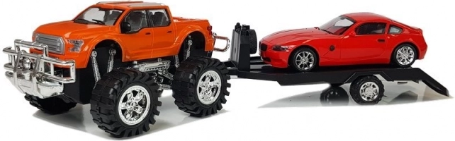 - Oranžový truck, červené auto, čierny príves