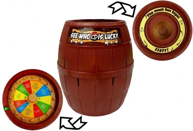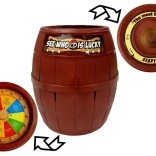 - Pirát, sud s otvormi, 16 farebných mečíkov, koleso šťastia s farbami