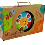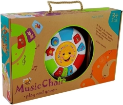 Veľké centrálne slniečko prehráva smiech a perkusie, mini piano so zvieratkami motivuje k objavovaniu hudby.