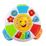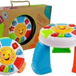 Interaktívny vzdelávací stolík je skvelou pomôckou na rozvoj sluchu, zraku a jemnej motoriky. Farebné prvky upútajú pozornosť a deti si pri hre precvičujú rozpoznávanie tvarov a farieb, koordináciu ruka–oko aj sústredenie. Veľké centrálne tlačidlo so slniečkom spúšťa smiech, perkusie a melódie, zatiaľ čo tvarové tlačidlá vydávajú veselé zvuky.