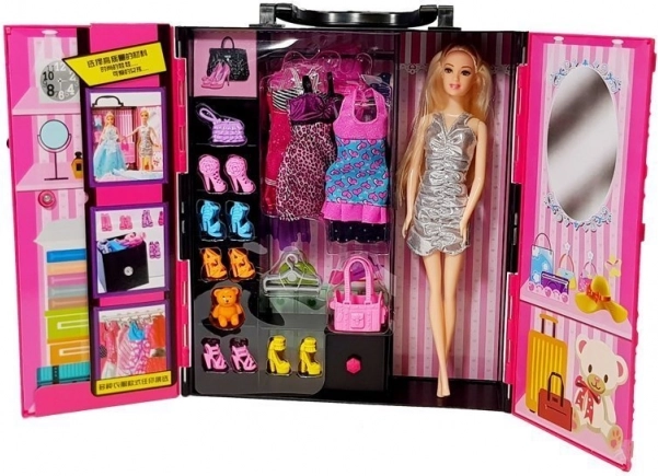 Štýlová sada pre malé milovníčky bábik: ružová kufríková skriňa s bohatou výbavou a dlhovlasou bábikou. Ponúka 4 šaty, 7 kabeliek, 5 párov topánok, vešiaky aj kefku na vlasy. Bezpečné materiály, certifikát CE, vhodné od 3 rokov – ideálne ako darček.