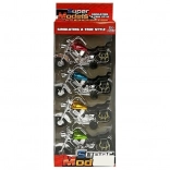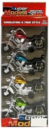 Táto súprava obsahuje štyri farebné modely motocyklov v farbách ružová, modrá, zlatá a zelená. Každý motocykel je vyrobený z odolného materiálu s funkčným naťahovacím mechanizmom: stačí motocykel potiahnuť dozadu a uvoľniť, čím sa rozbehne dopredu. Vďaka svojmu detailnému dizajnu tieto modely priťahujú pozornosť detských očí a zaručujú dlhotrvajúcu zábavu.