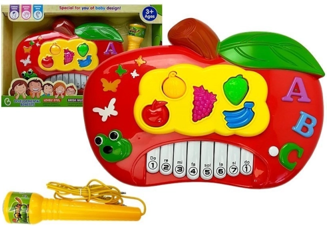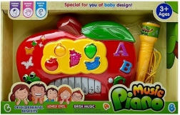 Roztomilé detské klavírik v tvare jablíčka s mikrofónom na karaoke poteší malých muzikantov. Ponúka 8 kláves, možnosť pripojenia telefónu cez kábel a vzdelávaciu hru s ovocnými tvarmi. Vďaka dvom jazykom (angličtina, španielčina) rozvíja hudobné aj jazykové zručnosti a svojimi živými farbami láka ku hre.
