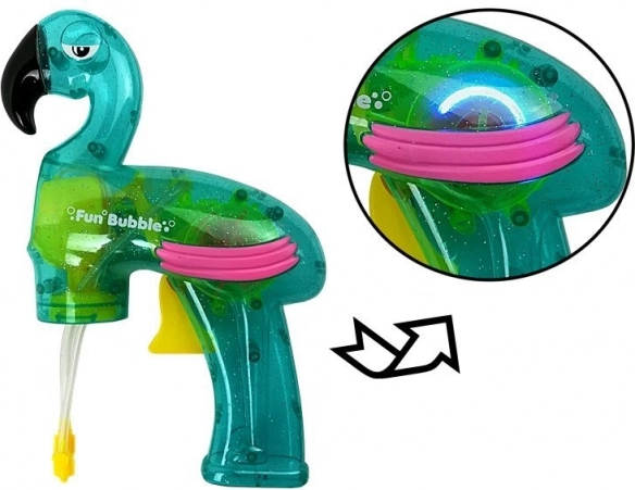 Tento pištole na bubliny kombinuje unikátny dizajn plameniaka s šikovnou konštrukciou, ktorá umožňuje rýchle vytváranie bublín. Je ľahko ovládateľná, a to aj pre menšie deti, vďaka obrázkovému návodu na zadnej strane balenia.