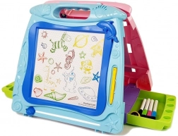 Táto univerzálna detská tabuľa ponúka dve plochy na nekonečné maľovanie a písanie: jedna strana je vhodná pre stierateľné fixky, druhá pre magnetické kreslenie so stylusom. K obrázkom sa deti môžu kedykoľvek vracať alebo ich jediným ťahom rýchlo zmazať posúvačom. Ľahká konštrukcia s praktickým držadlom a dvomi bočnými zásuvkami udrží všetky potreby po ruke.