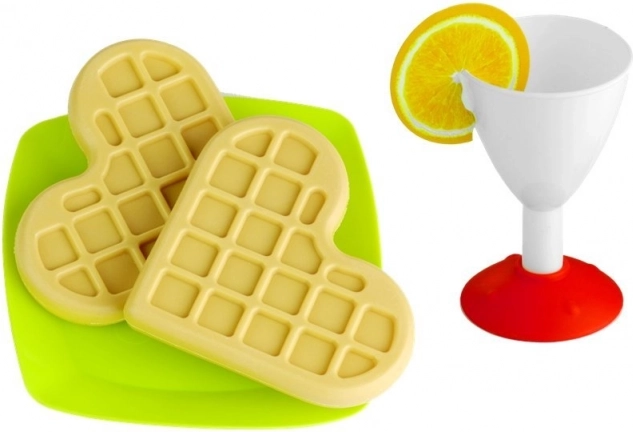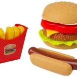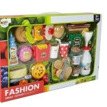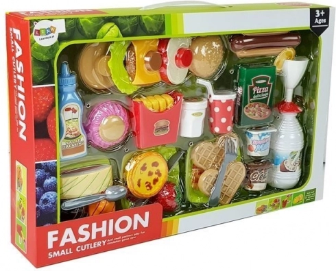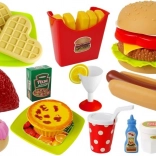 Set obsahuje rôzne potraviny ako hot dog, hranolky, wafle a mnoho ďalšieho. Všetky položky sú vyrobené z bezpečného a odolného plastu, vhodného pre deti staršie ako tri roky a certifikované podľa CE štandardu. Rozmery dielov sa pohybujú od 7 cm pri hranolkách po 12 cm pri kokosovom džúse, čo je ideálne pre malé detské ruky.