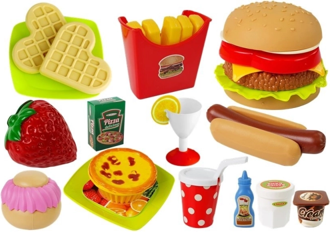 Herná kuchynka obsahuje bohatý výber položiek, od hamburgerov a hranoliek po sladké pochúťky, čo deťom umožňuje vytvárať rôzne scenáre a hry.