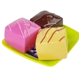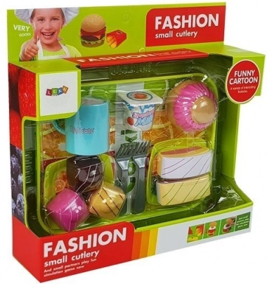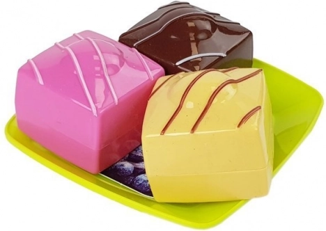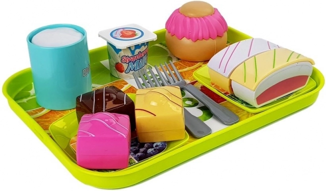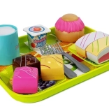 Súčasťou sady je podnos, tanieriky, vidličky, jogurtový kelímok, rôzne kúsky koláčov, hrnček a báječná bábovka. Hra s touto sadou prináša nekonečné množstvo možností na zábavnú hru.