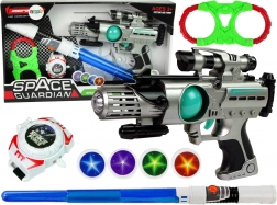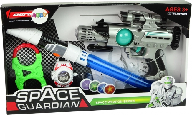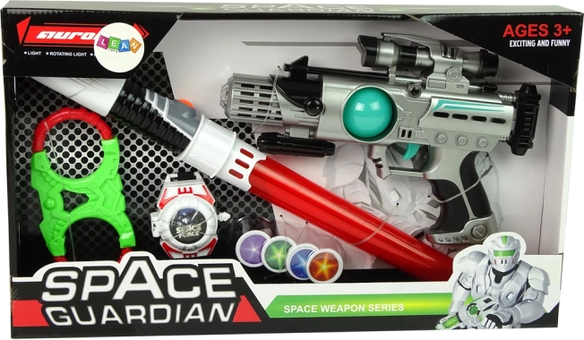 Sada vesmírnych zbraní Space Guardian je kompletný balíček pre všetkých malých dobrodruhov. Je vybavená nielen laserovou pištoľou, ale tiež svetelným mečom, play kľúkami a vystreľovačom diskov pre komplexný herný zážitok. Vďaka svetelným a zvukovým efektom je hra s touto sadou pútavejšia a kreatívnejšia.