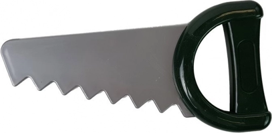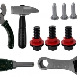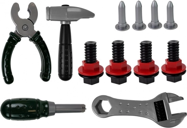 Píla, kladivo, kliešte, skrutkovač, kľúč, skrutky, matice a doštičky na skrutkovanie – všetko z odolného plastu bez ostrých hrán.
