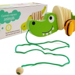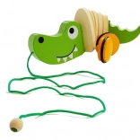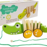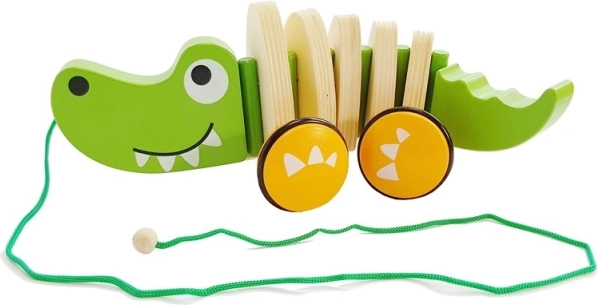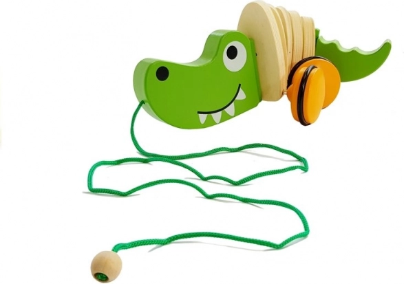 Priateľský zelený krokodíl s hladkým dreveným povrchom a oranžovými kolieskami je ideálny parťák na prechádzky po byte. Pri ťahaní sa jeho telo vlní a robí hru ešte zábavnejšou.