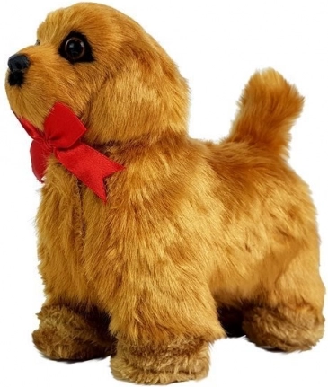 Roztomilý interaktívny psík s hnedým kožúškom reaguje na dotyk – šteká, hýbe hlavičkou a chvostíkom a po stlačení bruška kráča dopredu a hrá melódiu. Bezpečná hračka s certifikáciou CE a EN71 pre deti od 3 rokov, ideálna na rozvíjanie zodpovednosti a radostnú zábavu.