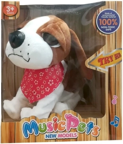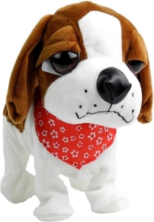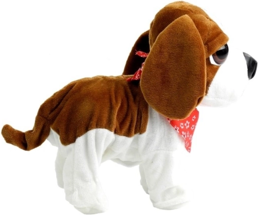 Roztomilý hnedo-biely plyšový psík na vodítku vie štekať, tancovať a spievať, hýbe chvostíkom a prináša deťom veľa zábavy aj učenia sa zodpovednosti. Vyrobený z mäkkých, netoxických materiálov, bezpečný od 3 rokov, s certifikáciou CE.