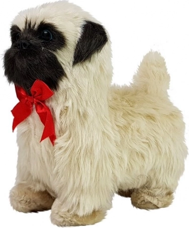 Krémová srsť s čiernymi detailmi a červená mašľa dodávajú hračke čaro. Ideálna na snívanie, maznanie aj na výstavku.