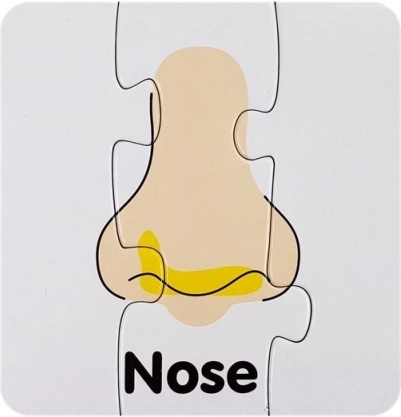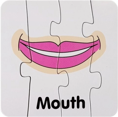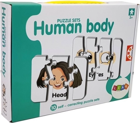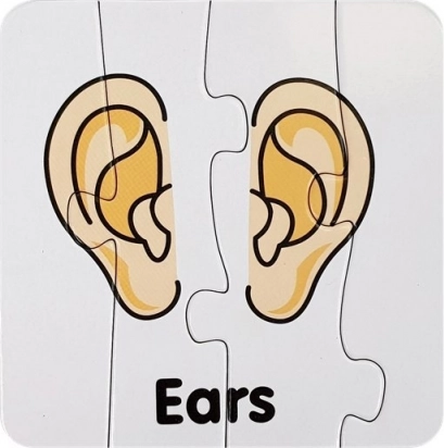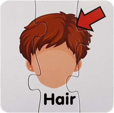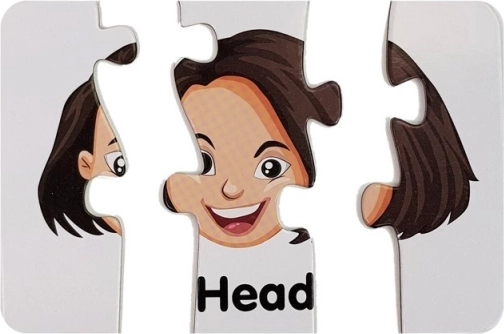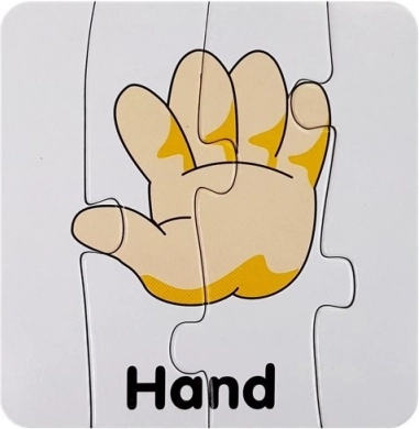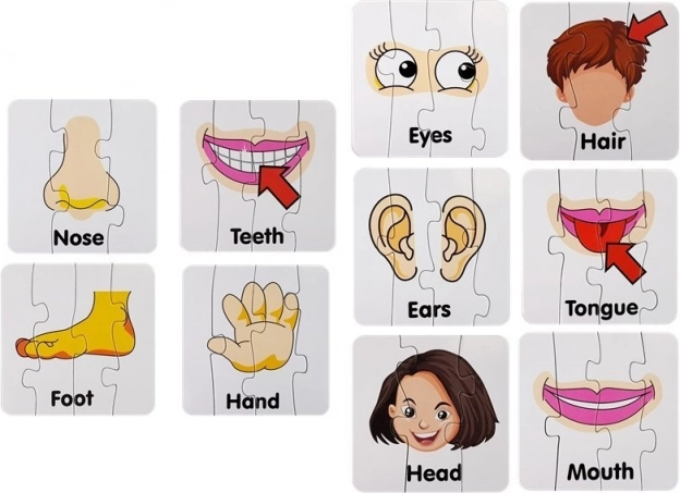 Táto sada obsahuje kartónové puzzle s ilustráciami častí tela, každá s jasným anglickým popisom (napr. Eyes, Nose, Mouth, Hand). Vďaka samosprávnemu párovaniu si deti ľahko skontrolujú správnosť, čo podporuje samostatnosť a sebavedomie.