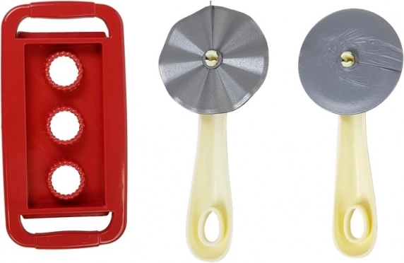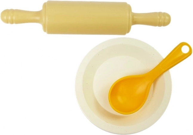 Sada obsahuje valček, lyžicu, špachtľu, nôž na servírovanie a misku – všetko pre realistickú hru v detskej kuchynke.