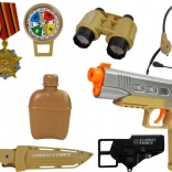 Vojenská sada s príslušenstvom Pištoľ Nôž Ďalekohľad Slúchadlá Píšťalka Krátkovlnná vysielačka