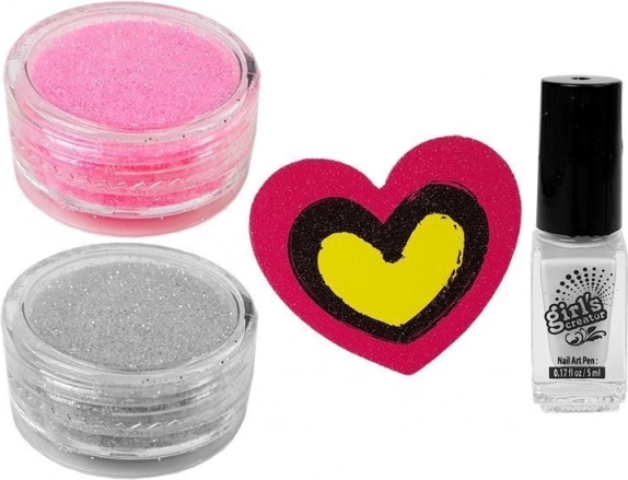 Sada obsahuje všetky nevyhnutné nástroje, ako je bezfarebný lak, pilník v tvare srdca, brokát v ružovej a striebornej farbe a samolepiace šablóny.