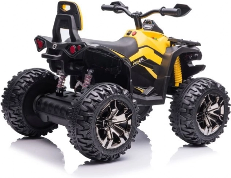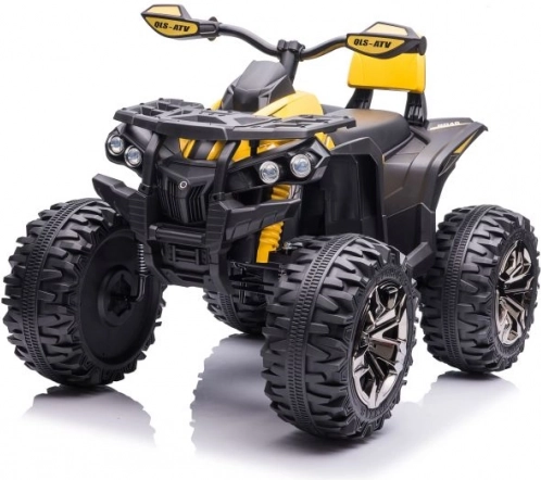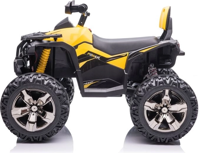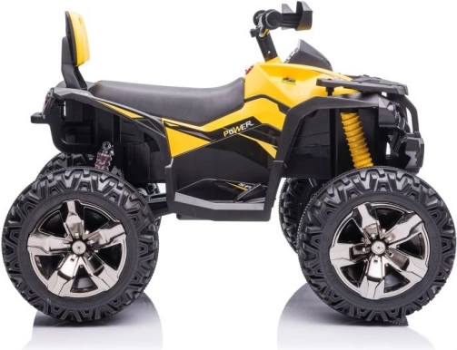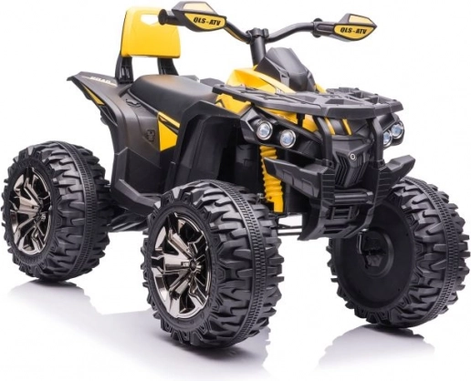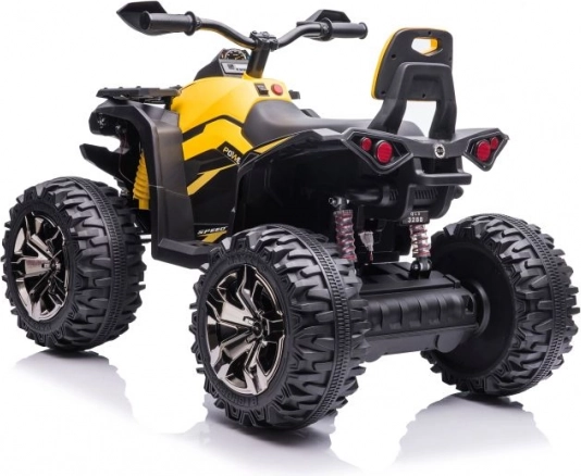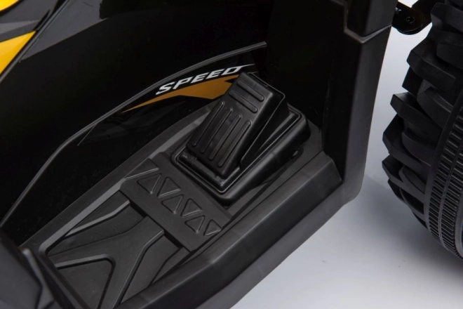 Žlto‑čierne prevedenie, riadidlá so zrkadlami a detaily podvozka dodávajú štvorkolke vzhľad skutočného ATV.