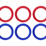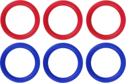 Šesť odolných plastových krúžkov v dvoch farbách (červená a modrá) umožní hrať súčasne viacerým deťom aj dospelým.