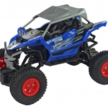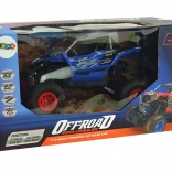 Modré terénne vozidlo je vybavené veľkými, červenými kolesami a odpružením pre jazdu na akomkoľvek povrchu. Jeho plastová konštrukcia zaisťuje odolnosť.