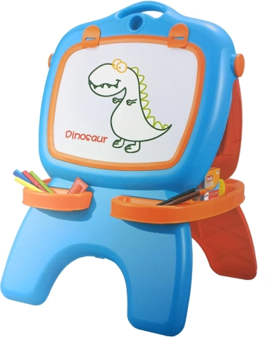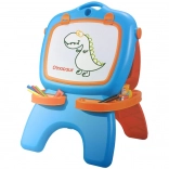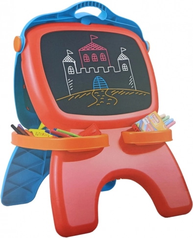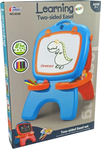 Obojstranná magnetická a kriedová tabuľa pre malých umelcov aj školákov ponúka bielu plochu na suché mazanie a čiernu plochu na kreslenie kriedou. V balení nájdete 12 fixiek, 12 kried, šablóny písmen a tvarov, praktické zásuvky na doplnky a háčik na uchytenie papiera. Podporuje kreativitu, jemnú motoriku a koordináciu oko–ruka.