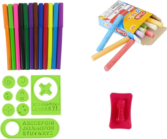 - 12 farebných fixiek, 12 farebných kried, šablóna s geometrickými tvarmi, šablóna s písmenami, svietiaca fixka, háčik na papier, úložné zásuvky