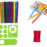 12 farebných fixiek, 12 farebných kried, šablóna s geometrickými tvarmi, šablóna s písmenami, svietiaca fixka, háčik na papier, úložné zásuvky