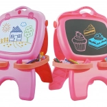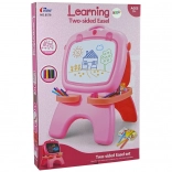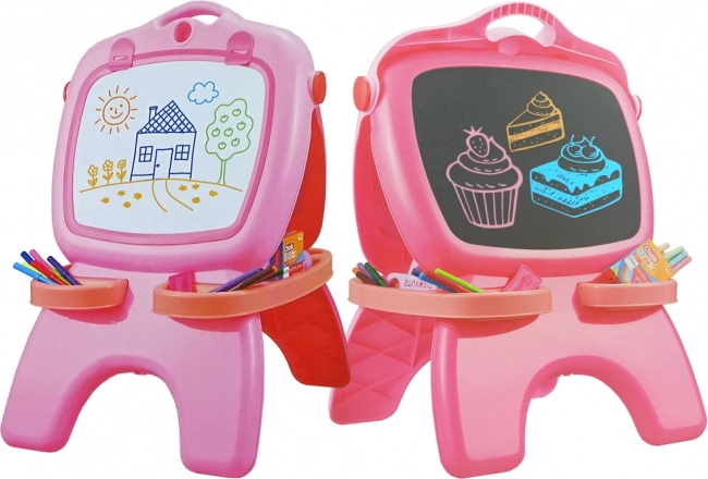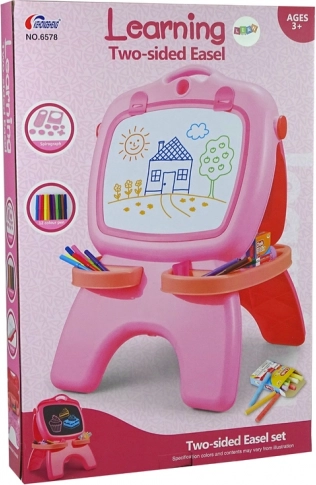 Tabuľa má dve plochy: bielu magnetickú na stierateľné popisovače a čiernu kriedovú. Praktická zásuvka udrží všetko príslušenstvo poruke, zatiaľ čo háčik na papier umožní uchytiť hárok a maľovať ako na stojane. Stabilné rozmery 64 × 44 × 30 cm a výška plochy 30 cm sú prispôsobené deťom od 3 rokov.