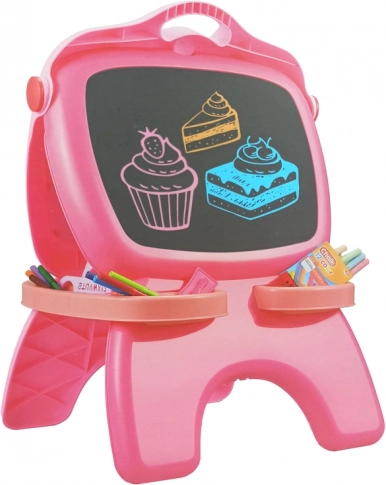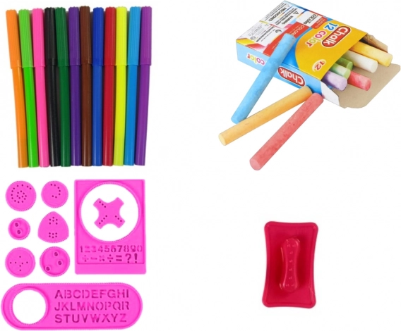 Objavte obojstrannú magnetickú a kriedovú tabuľu, ktorá podporí kreativitu aj učenie. Biela strana je na stierateľné popisovače, čierna na kriedu. Súčasťou je 12 popisovačov a 12 kried, šablóny tvarov a písmen, svetelný fix, praktická zásuvka na doplnky a háčik na papier. Kompaktné rozmery 64×44×30 cm. Vhodné od 3 rokov, spĺňa EN71 a CE.