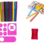 - Tabuľa, 12 popisovačov, 12 kried, šablóna s tvarmi, šablóna s písmenami, svetelný fix
