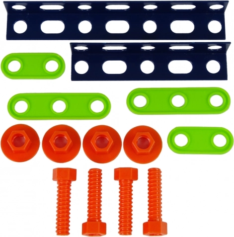 Súčasťou sú skrutky, matice, podložky a uholníky na prvé konštrukcie a tréning jemnej motoriky.