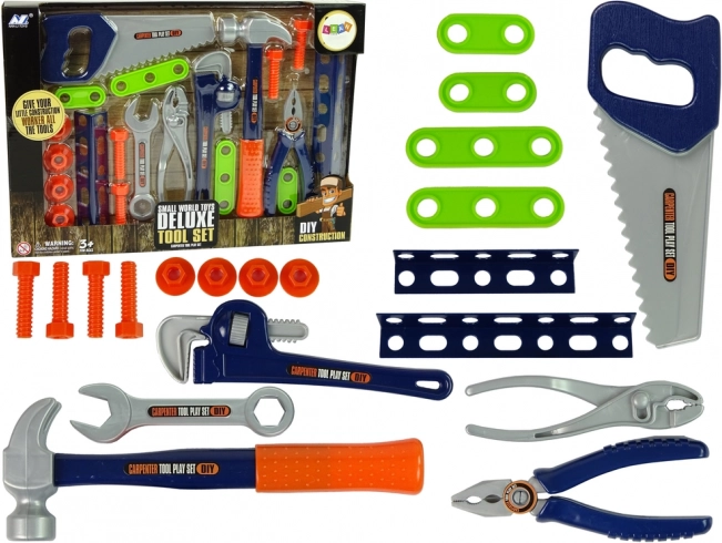 V balení nájdete všetko, čo malý opravár potrebuje: kladivo, pílu, francúzsky kľúč, kliešte (2 ks), rôzne kľúče, podložky, uholníky, skrutky (4 ks) a matice (4 ks). Deti môžu stavať jednoduché konštrukcie, trénovať skrutkovanie a napodobňovať dospelých pri majstrovaní.