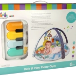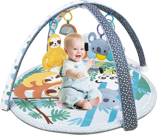 Táto mäkká a bezpečná edukačná podložka s motívom džungle ponúkne bábätku inšpiratívny priestor na každodenné objavovanie. Farebné závesné hračky (koala, lenochod, hrkálky) a odrazový panel fungujúci ako zrkadielko prirodzene motivujú dieťa k naťahovaniu, úchopu a otáčaniu. Súčasťou je odnímateľné pianínko so svietiacimi klávesmi, ktoré po stlačení vydávajú tóny a melódie – ideálne na rozvoj sluchu a zmyslu pre rytmus.