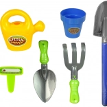 - Sada zahŕňa vedierko, kvetináč, lopatku, kanvu, graca a ryľ.