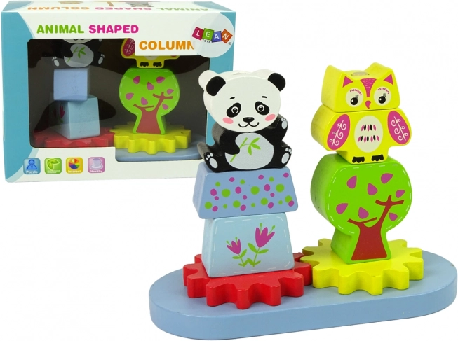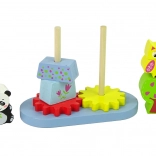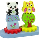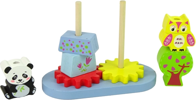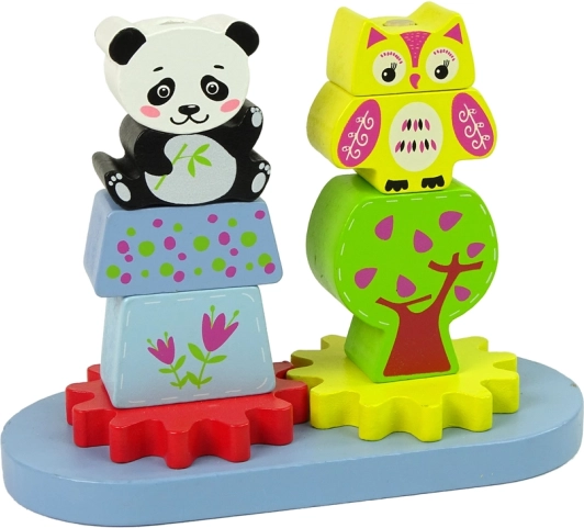 Tento fantastický drevený set sa skladá zo základne s kockami rôznych tvarov a veľkostí, ktoré predstavujú zvieratá ako pandu a sovu. Obsahuje tiež dve ozubené kolesá, ktoré pridávajú pohyb do hry. Tieto kocky sú ideálne pre rozvoj manuálnych a presných zručností malých detí, keď ich umiestňujú na vystupujúce ramená.