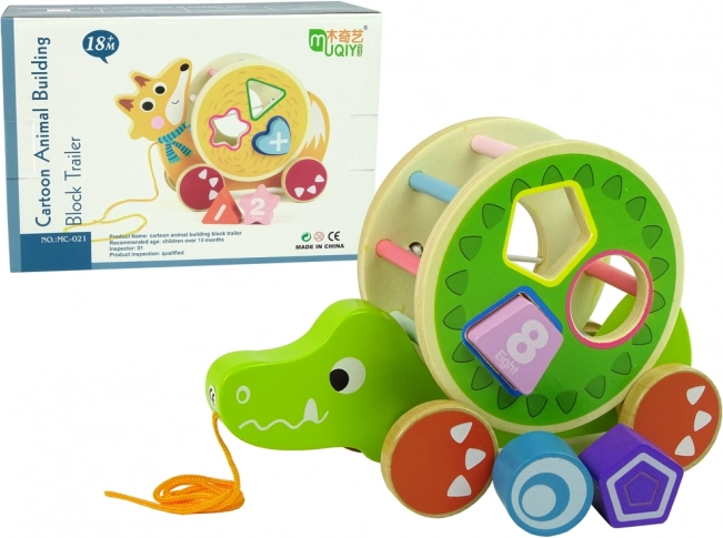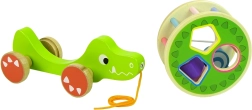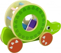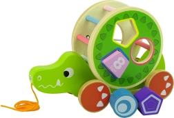 Drevená hračka krokodíl so sorterom ponúka radu vzdelávacích prvkov. Veľký okruh so sorterom a tromi blokmi na chrbte umožňuje cvičiť presnosť, rozpoznávanie geometrických tvarov a zlepšuje koncentráciu i logické myslenie. Krokodíl je vybavený farebnými paličkami, ktoré stimulujú zrakové zmysly dieťaťa a kolesá so šnúrou uľahčujú pohyb hračky. Bloky vo vnútri fungujú ako hrkálka, čo deti zaujme a podnecuje ich sluchové zmysly. Odnímateľný kruh na chrbte krokodíla umožňuje viac variant hier.