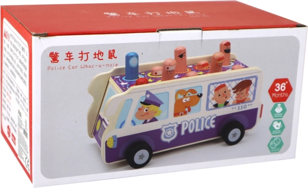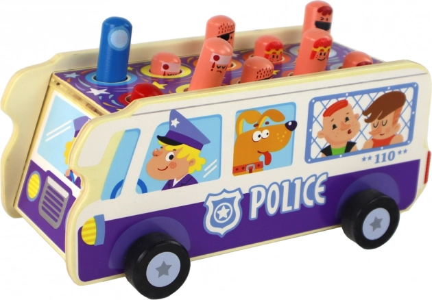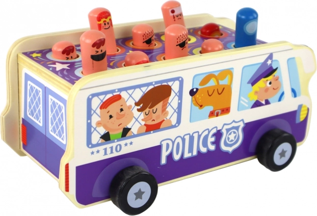 Policajný autobus z masívneho dreva spája tradičnú „búchačku“ s jazdou na kolieskach. Deti kladivkami triafajú vysúvajúce sa kolíky–postavičky a trénujú presnosť, sústredenie aj postreh. Odolné spracovanie a hravé ilustrácie lákajú k opakovanej hre a podporujú fantáziu.